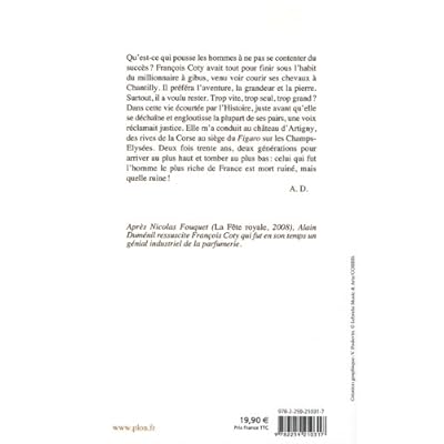 Qu'est-ce qui pousse les hommes a ne pas se contenter du succès ? François Coty avait tout pour finir sous l'habit du millionnaire à gibus, venu voir courir ses chevaux à Chantilly. Il préféra l'aventure, la grandeur et la pierre. Surtout, il a voulu rester. Trop vite, trop seul, trop grand ? Dans cette vie écourtée par l'Histoire, juste avant qu'elle se déchaîne et engloutisse la plupart de ses pairs, une voix réclamait justice. Elle m'a conduit au château d'Artigny, des rives de la Corse au siège du Figaro sur les Champs-Elysées. Deux fois trente ans, deux générations pour arriver au plus haut et tomber au plus bas : celui qui fut l'homme le plus riche de France est mort ruiné, mais quelle ruine ! A.D. Après Nicolas Fouquet (La Fête royale, 2008), Alain Duménil ressuscite François Coty qui fut en son temps un génial industriel de la parfumerie.